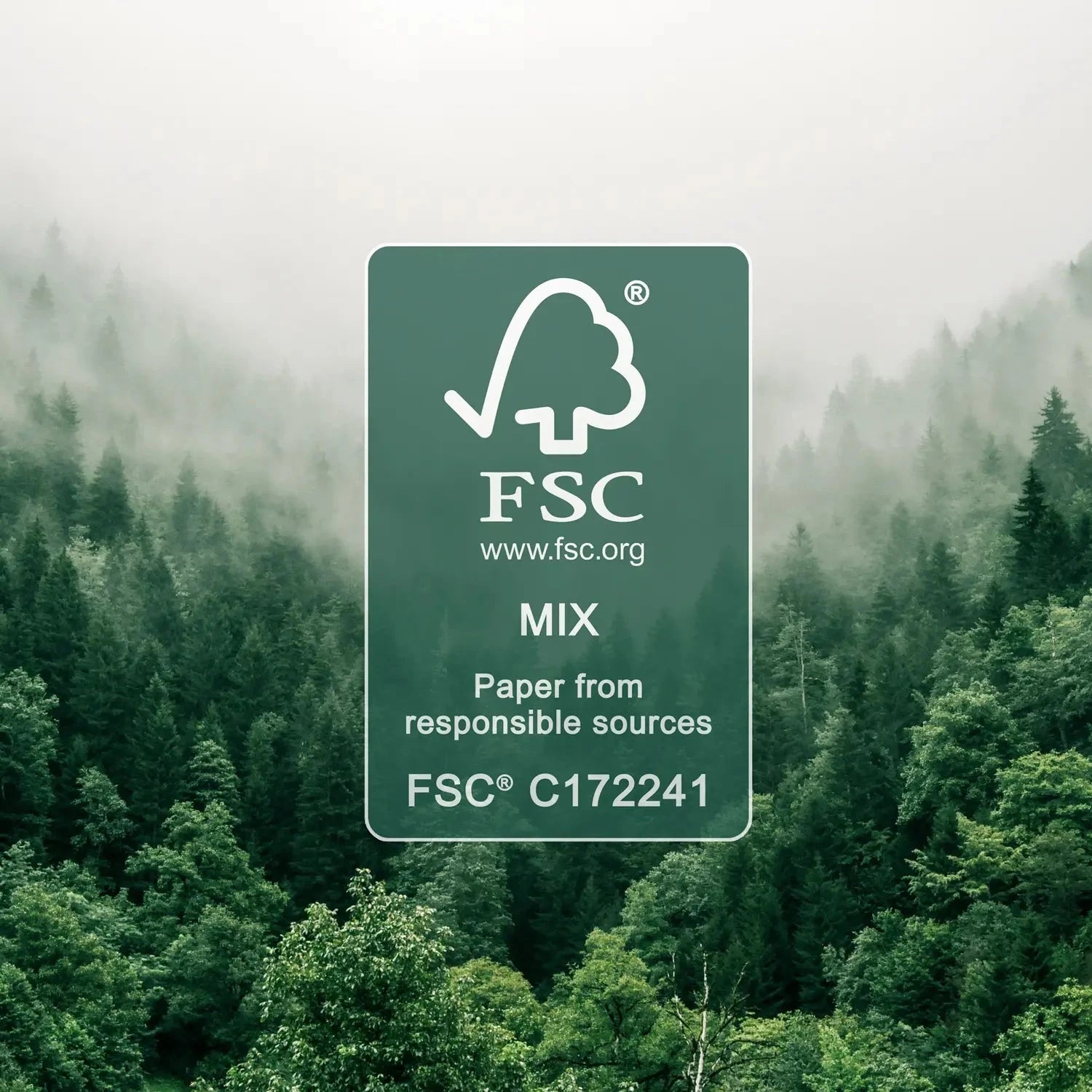- FSC Certification: The use of ecological paper from sustainable forests and our compliance to European Community Regulation on chemicals and their safe use are our commitment to the environment