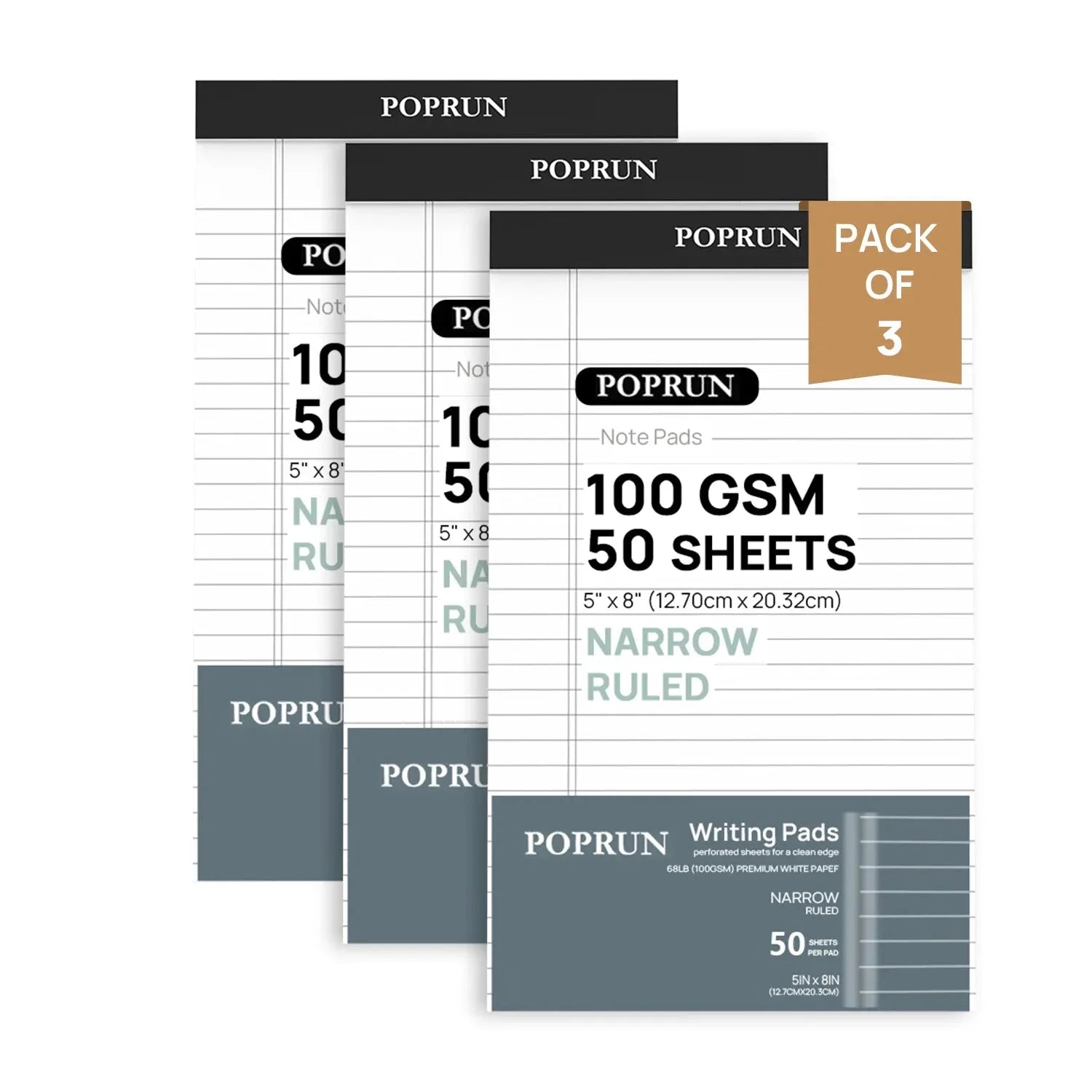 - Premium Quality & Durable Lined Paper: POPRUN Legal Pads contains 50 sheets (per Pack) of 100GSM thick white paper — equivalent to the thickness of 125 sheets of 80GSM paper — paired with a bleed-resistant surface that enables effortless writing with pens or pencils.