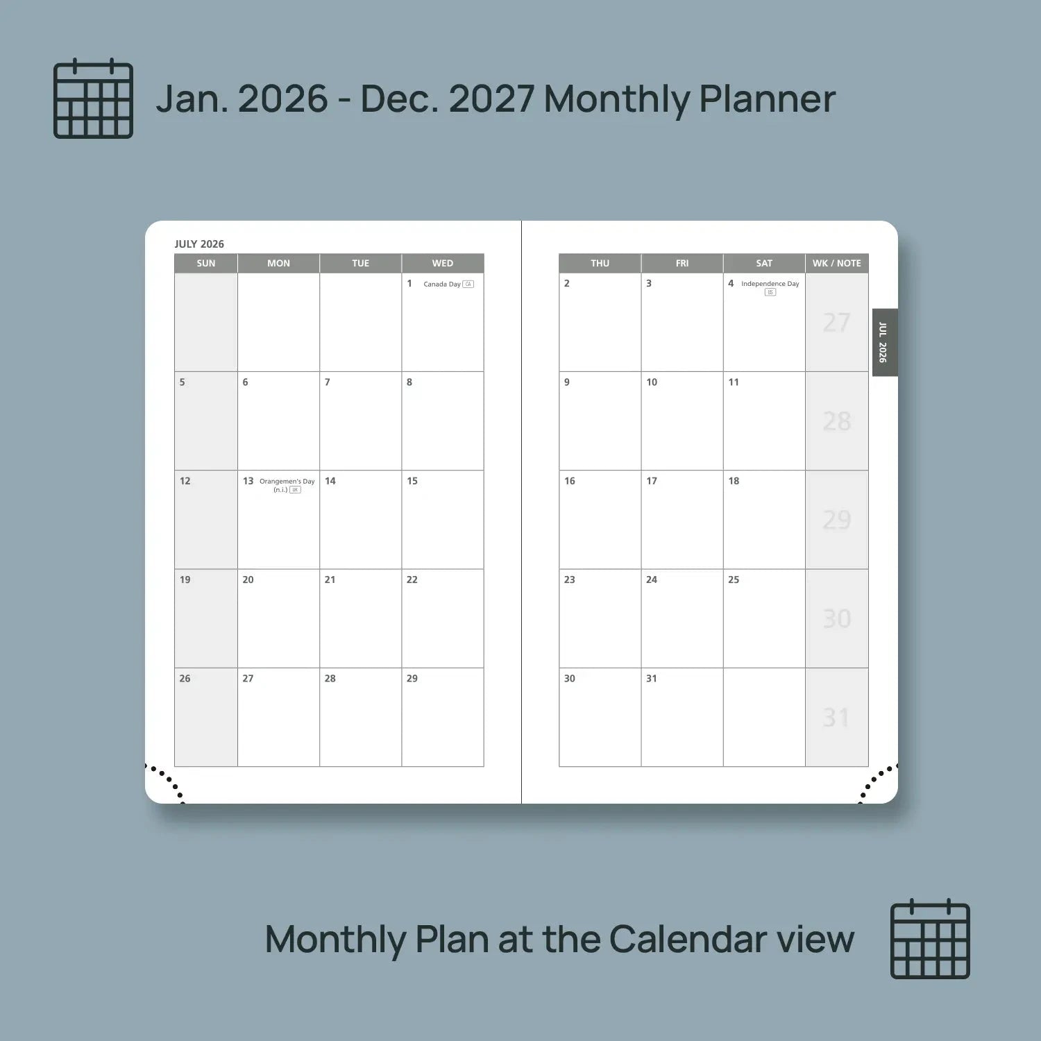 POPRUN 24 Month - Softcover Monthly planner Our 2026-2027 personalized planner runs for 24 months from January to December. Inside, there are weekly and monthly overviews with lots of plenty of room to record all your goals and to-do events and check progress at any time. Great for long-term planning as well as documenting fun plans for the future. Whether it's tracking work progress, scheduling important meetings, or planning your personal life, our planner can be a reliable partner in achieving your goals and self-improvement. |